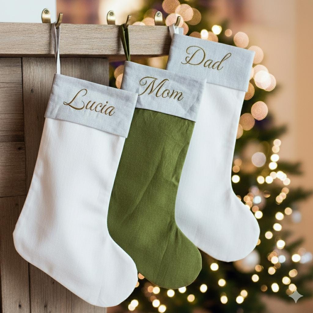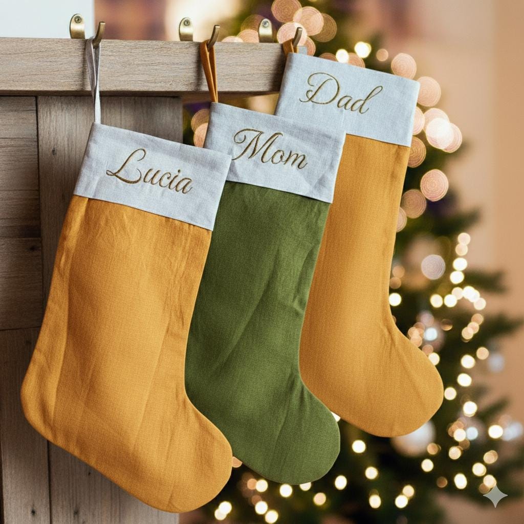 Linen Christmas Stocking with Cuff, Handmade Personalized Stocking, Embroidered Stocking, Family Matching Stocking, Christmas Gift