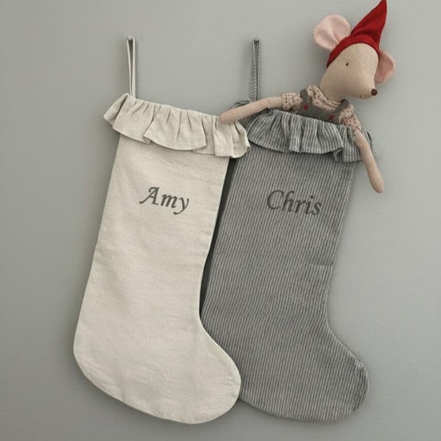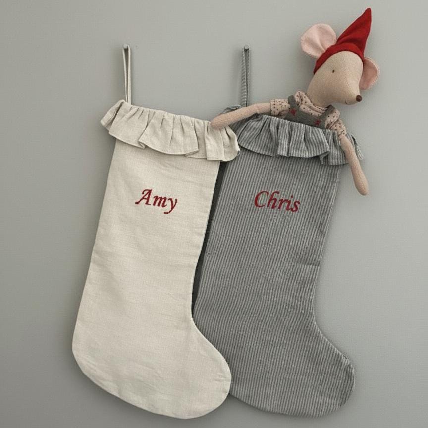 Custom Linen Family Stocking with ruffles, Handmade Holiday Stocking, Christmas Family Gift, Kids Gift for Christmas