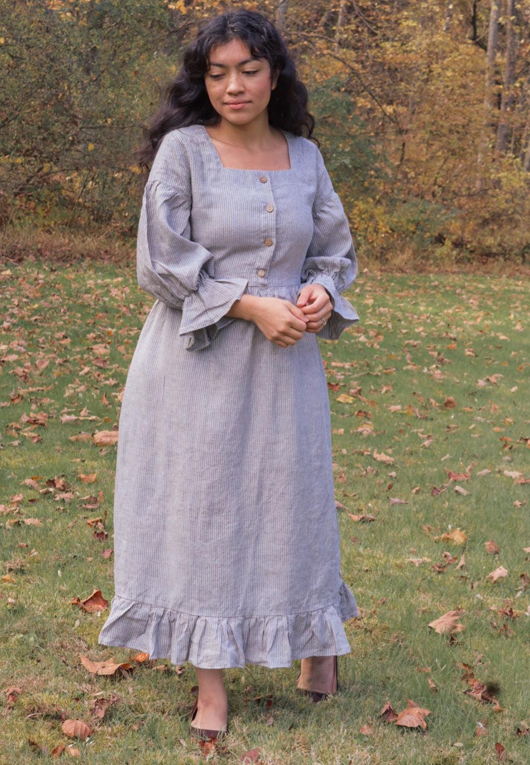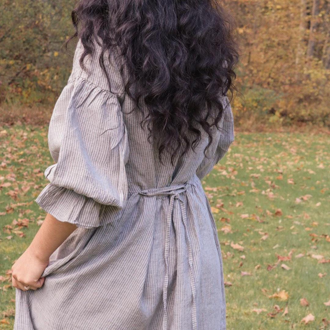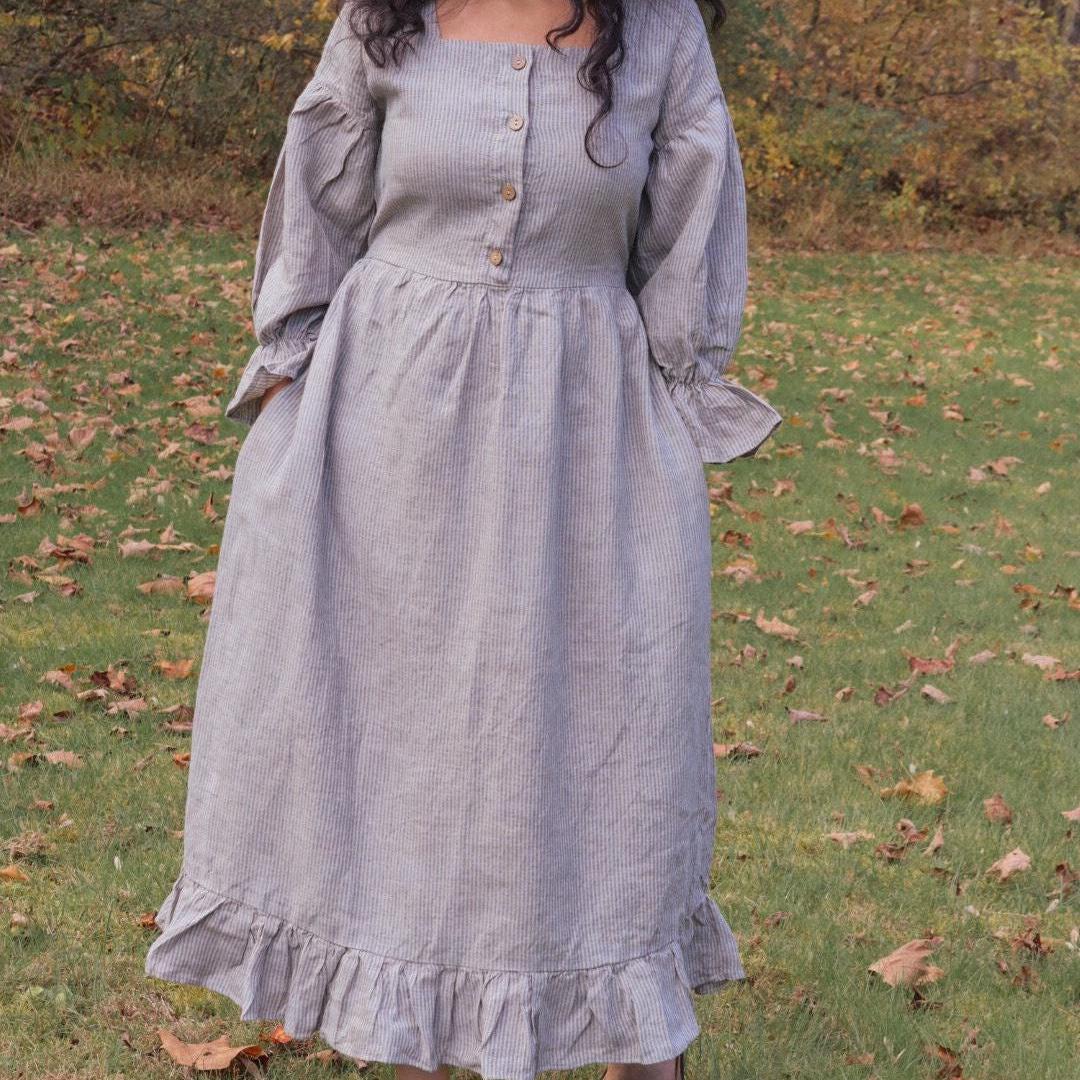 Linen Long Sleeve Dress with Back Tie and Pockets Wooden Button Casual Maxi Dress Modest Linen Dress for Women Gift for Mom Dress_121
