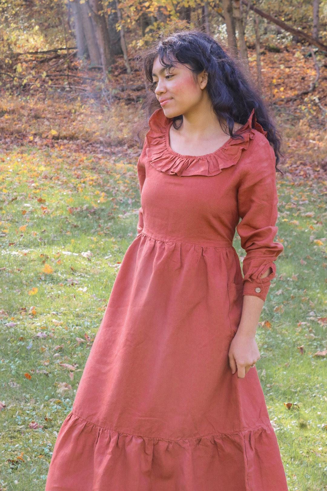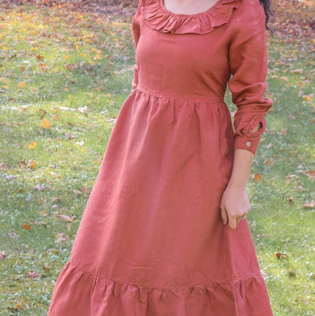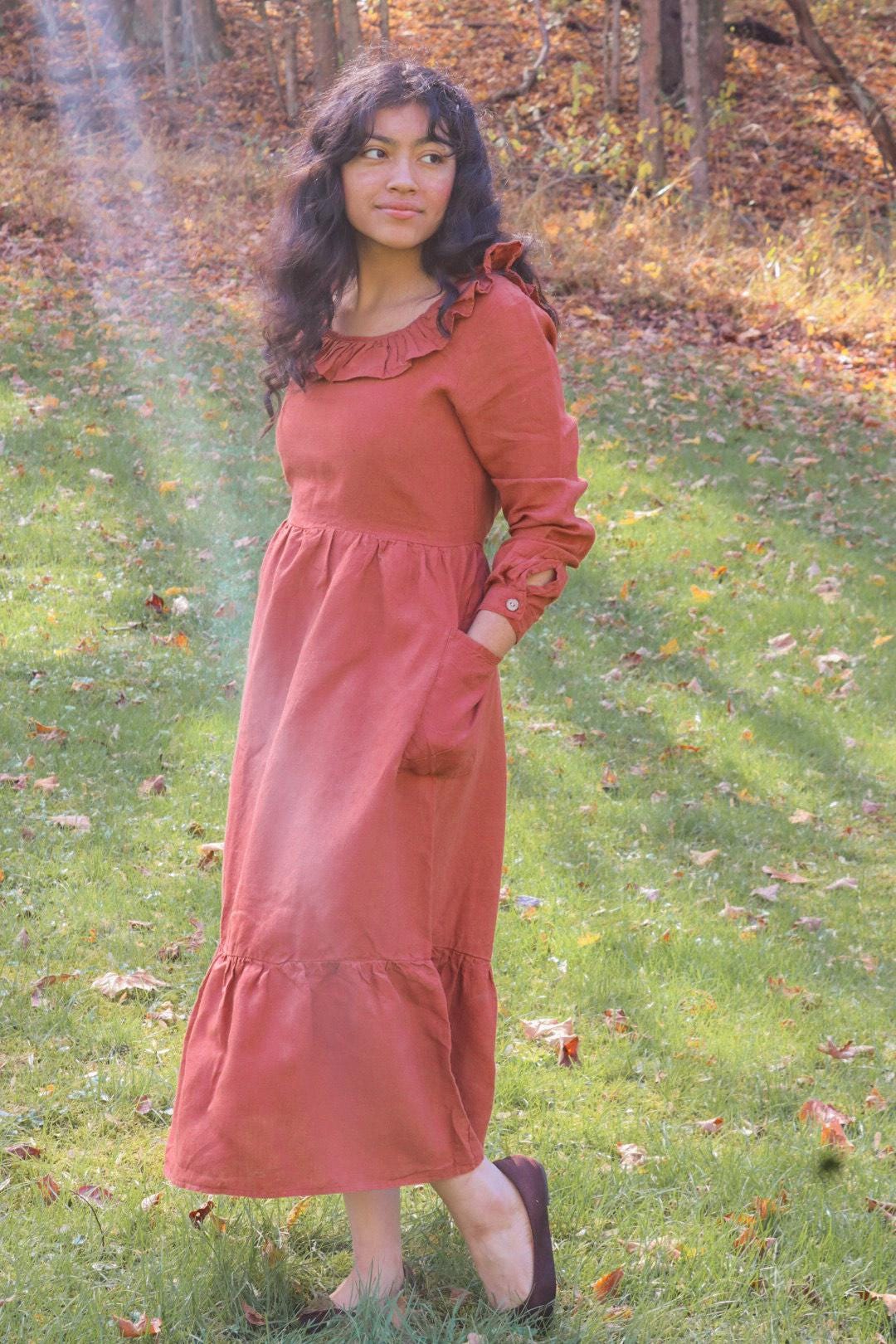 Linen Fall Dress with Hidden Pockets Linen Boho Dress with Long Sleeves Linen Christmas Gift for her Mom Gift Linen women Clothing dress_109